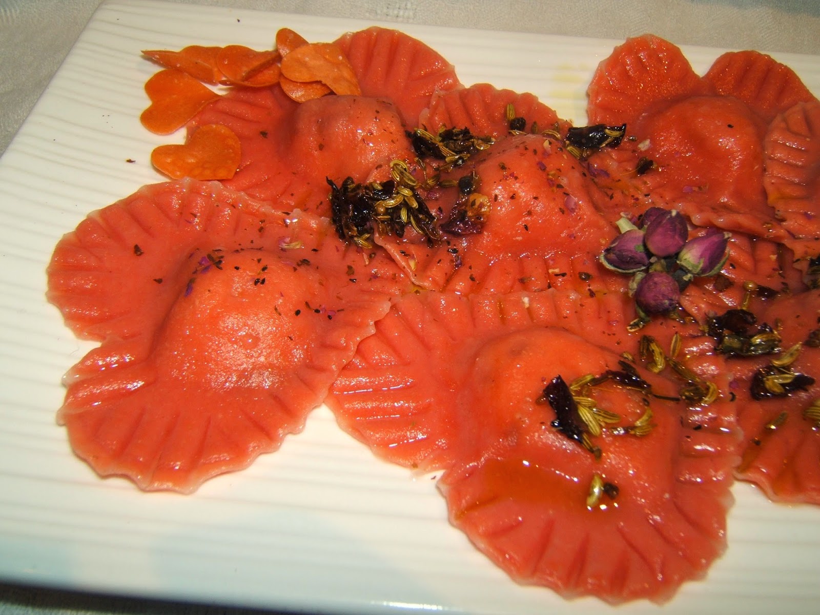 Ho voluto usare una pasta colorata. Per colorarla aggiungere all’acqua 50 gr. di concentrato di pomodoro oppure tre cucchiai di barbabietola rossa lessata e frullata. Se la pasta risultasse poi troppo molle aggiungere farina.